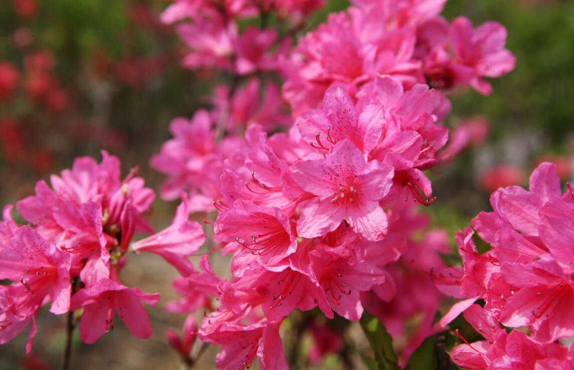 江苏连云港花果山景区万年山花海位于南云台林场青峰顶东侧,近300亩盛开的杜鹃花红遍山岗,形成了高山独特的杜鹃花海美景。