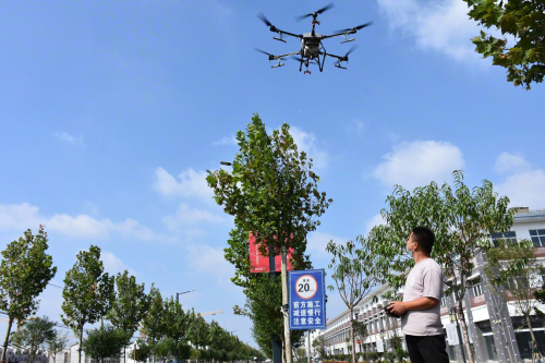 9月29日,东海县桃林镇,技术人员操作无人机,对街道旁树木进行药物喷洒,防治刺蛾和美国白蛾,日喷药可达500亩。