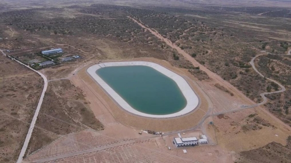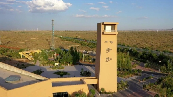 这里是甘肃省武威市古浪县八步沙林场,引黄河水建成的八步沙沙产业水源工程调蓄水池正在这里发挥着重要作用。