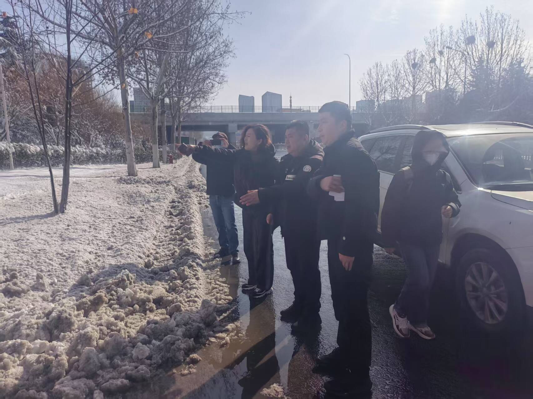 区园林绿化服务中心分管负责同志协调街道、环卫等部门巡查全区重点道路绿化带,防止含融雪剂的雪水污染绿地。